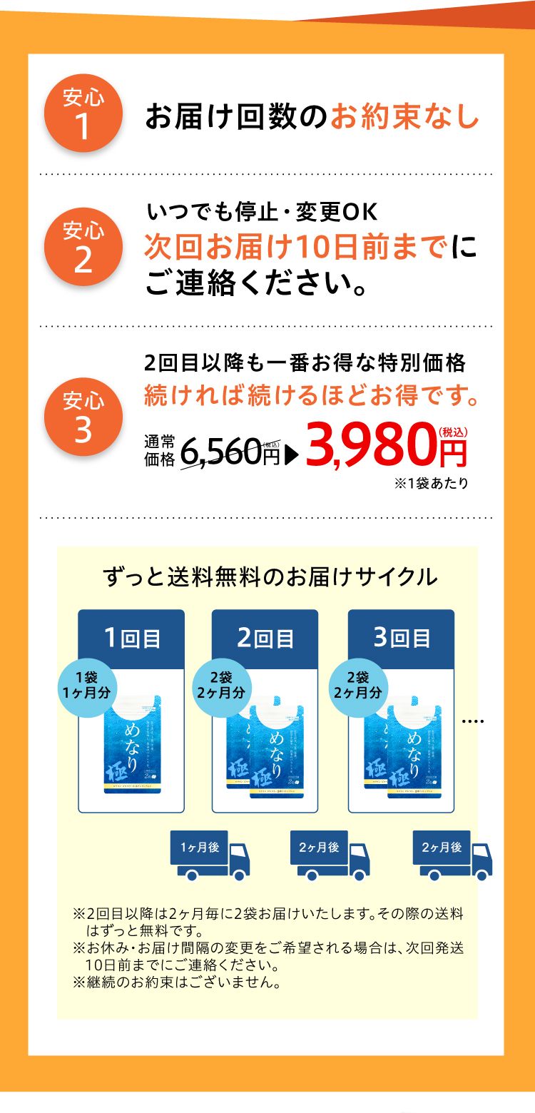 - 2回目は初回発送日から30日後、3回目以降は60日ごとにお届けします。次回お届け日は、マイページまたは納品書にてご確認ください。
